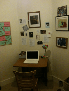 Stephen King in On Writing, says that you should write the first draft of any novel in a quiet space, without interruption, and you should never show it to anyone until it is finished. So, in preparation for writing my Great First Novel, I have sorted out the space in the spare room so I can work there. It’s not ideal – it’s where P keeps all his clothes (clean and dirty) and also the home for all that stuff that has nowhere else to live. But it is a space, nonetheless, and now that I’ve personalised it a little more, with pictures from my Favourite Little Person and a noticeboard full of PLOT, it feels much much better.