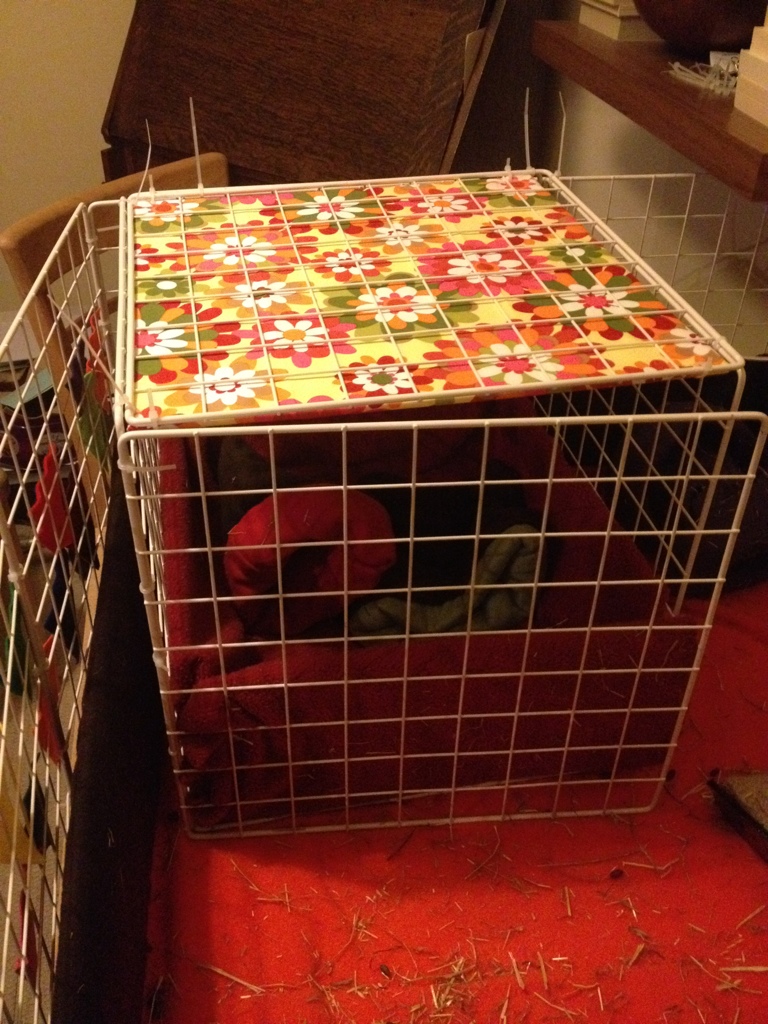 So I built them a mini-cage, with an opening door, so that they can just hop in (maybe with a cucumber bribe) and I can just shut the door and carry them off.