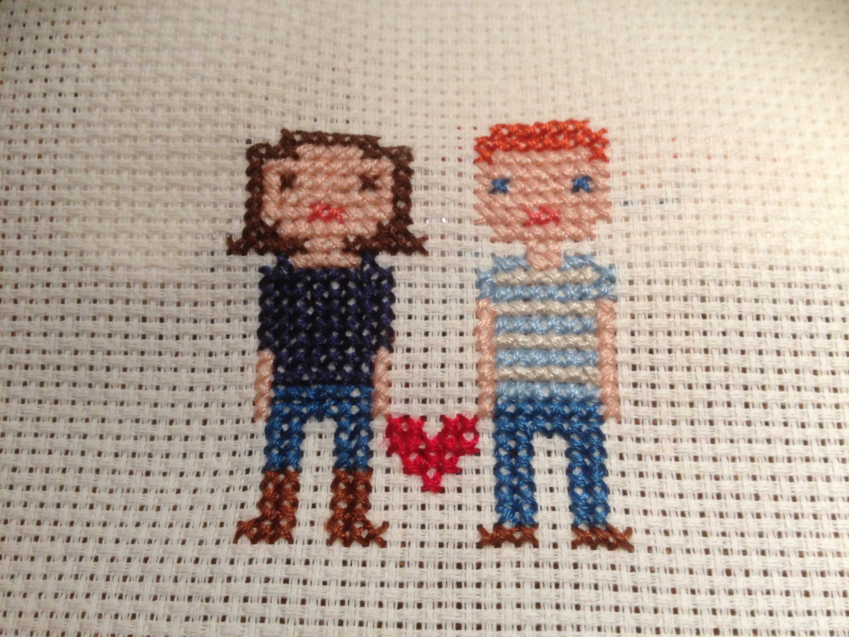 For the Husband’s birthday (which I, unforgivably, forgot about until he mentioned it 3 days before) I stitched up a little pixelpair of us. Using MacStitch, it’s easy enough to create your own designs, even if you lack any artistic talent, as I do.